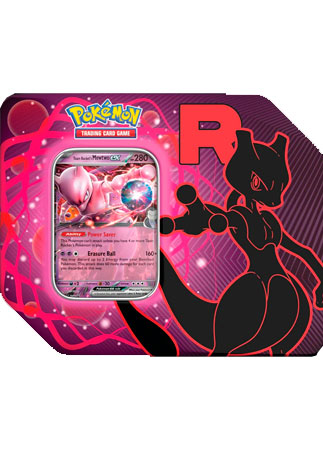 Lata coleccionable con 1 carta promo holográfica de Team Rocket’s Mewtwo ex y 5 sobres de refuerzo. Diseño negro/rojo con la R del Equipo Rocket.